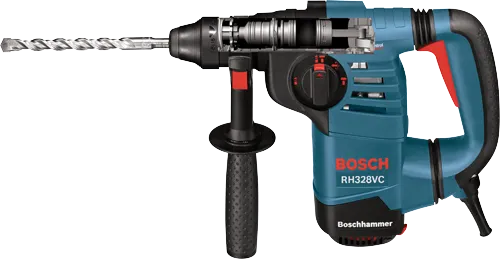 The Bosch RH328VC SDS-plus® 1-1/8 In. Rotary Hammer can deliver 2.4 Ft.-Lbs. of impact energy, but this tool weighs only 7.7 Lbs. and is a compact length of 12.5 In., for an outstanding power-to-size ratio. The 8.0-amp motor generates up to 4,000 blows per minute, making it an ideal choice for construction or demolition. The multifunction selector gives the user the versatility to match mode to application – rotary hammer, rotation-only or hammer-only mode. It has Vibration Control in the hammer mechanism and grip area to provide improved user comfort. The hammer provides an integral clutch that discontinues power transmission for bind situations, and it has Vario-Lock to set the chisel into one of 12 positions for better leverage.