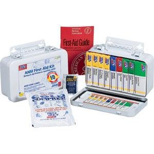 This 64-piece, 10-unit ANSI compliant kit holds all 10 ANSI required items in a sturdy metal case with a gasket.