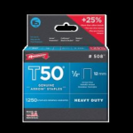 T50 1/2 Inch (12mm) Staples Leg length: 1/2″ (12mm) Crown width: 3/8″(10mm) Pack size: 1,250 Perfect for use with the T50®OC stapler Flat crown3