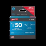 T50 9/16 Inch (14mm) Staples Leg length: 9/16″ (14mm) Crown width: 3/8″ (10mm) Pack size: 1,250 Flat crown
