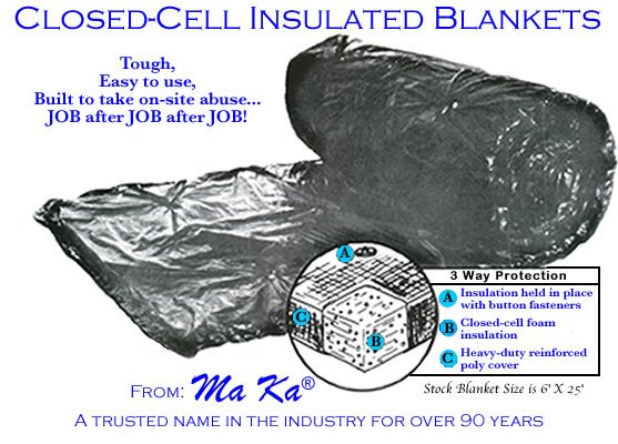 Lightweight and easy to handle, the Ma Ka® Closed-Cell Insulated blankets help fresh concrete to cure in cold weather. Fresh concrete has its own heat, called heat of hydration. In many circumstances, if properly trapped and insulated, this heat will be generated in sufficient quantity to be the only source of heat necessary during a 3 day curing cycle.