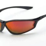 KP6 red mirror lens, shiny black frameColored mirrored surface over a smoke base lens diminishes glare by asorbing reflection across the mirror surface. Good for bright outdoor conditions.
