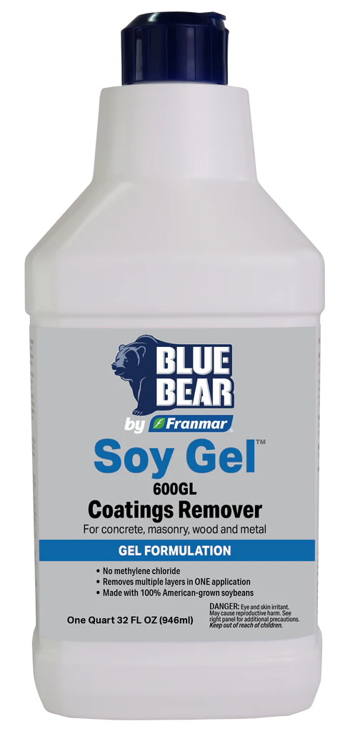 A longtime favorite of contractors and other professionals, BLUE BEAR® Soy Gel™ 600GL Coatings Remover works on nearly all types of coatings. It clings to vertical surfaces, encapsulates coatings and migrates through multiple layers, down to wood, metal, brick or concrete. Made with American-grown soybeans, it’s low-odor, non-caustic and biodegradable.