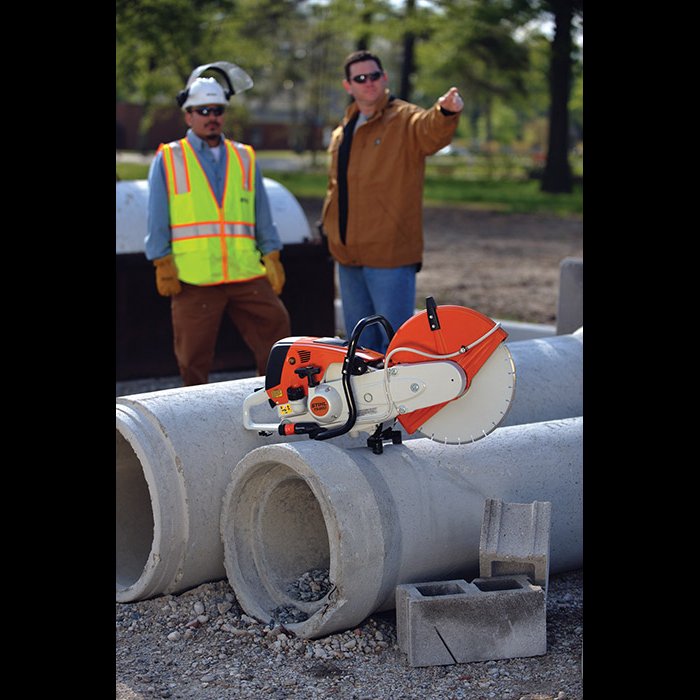 The TS 800 STIHL Cutquik® cut-off machine features a magnesium guard making the machine a full 0.7 pounds lighter than the previous model. The TS 800 features a 16” cutting wheel, the largest size we offer in a handheld design. When used with the optional STIHL Cutquik® cart, the TS 800 is an excellent alternative to conventional walk behinds because it can be used as a handheld or quickly snapped into our cart for long, straight, controlled cuts. It’s also fuel efficient, with enough power to cut through asphalt, concrete, rebar, iron and steel with ease.